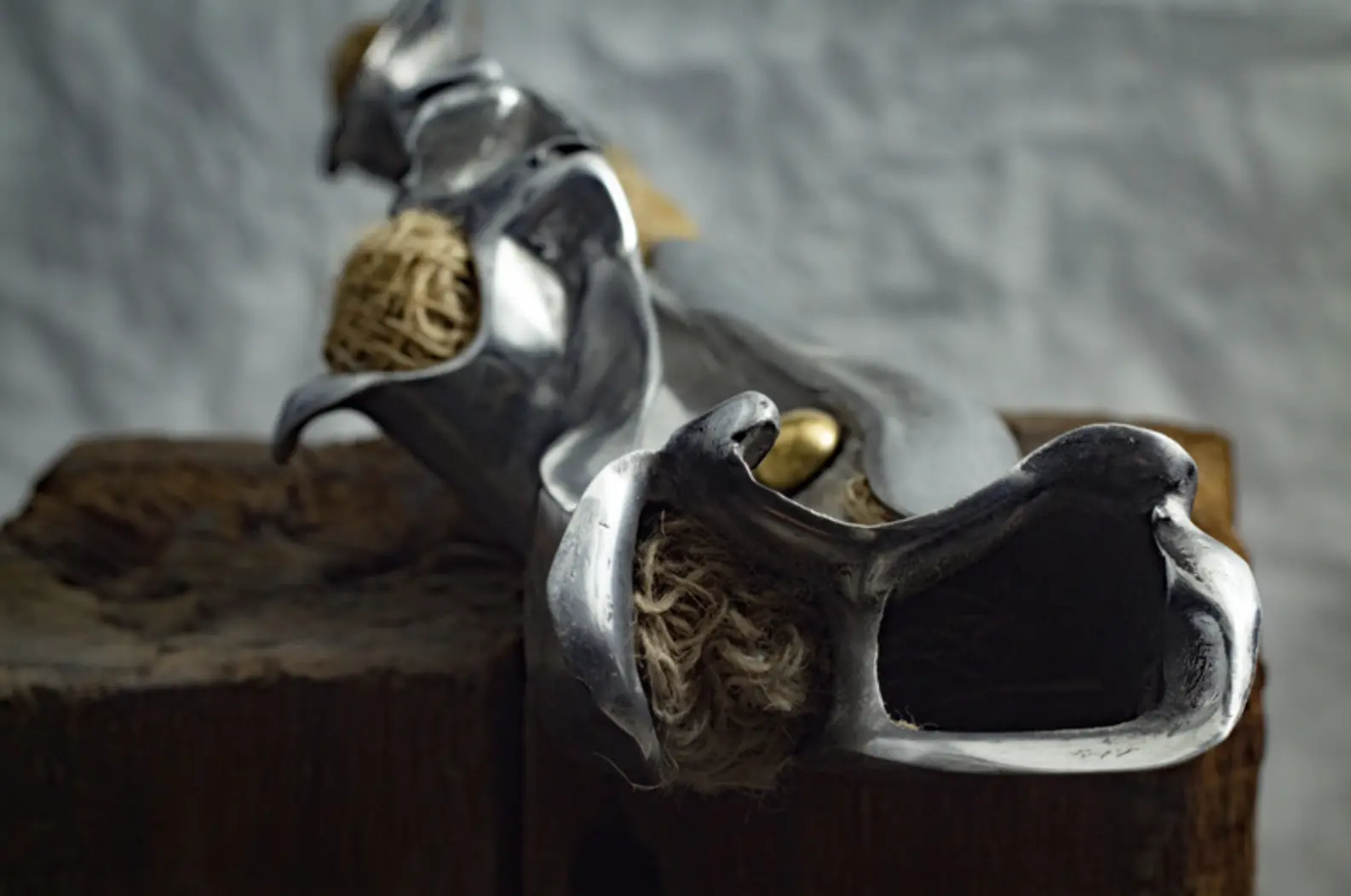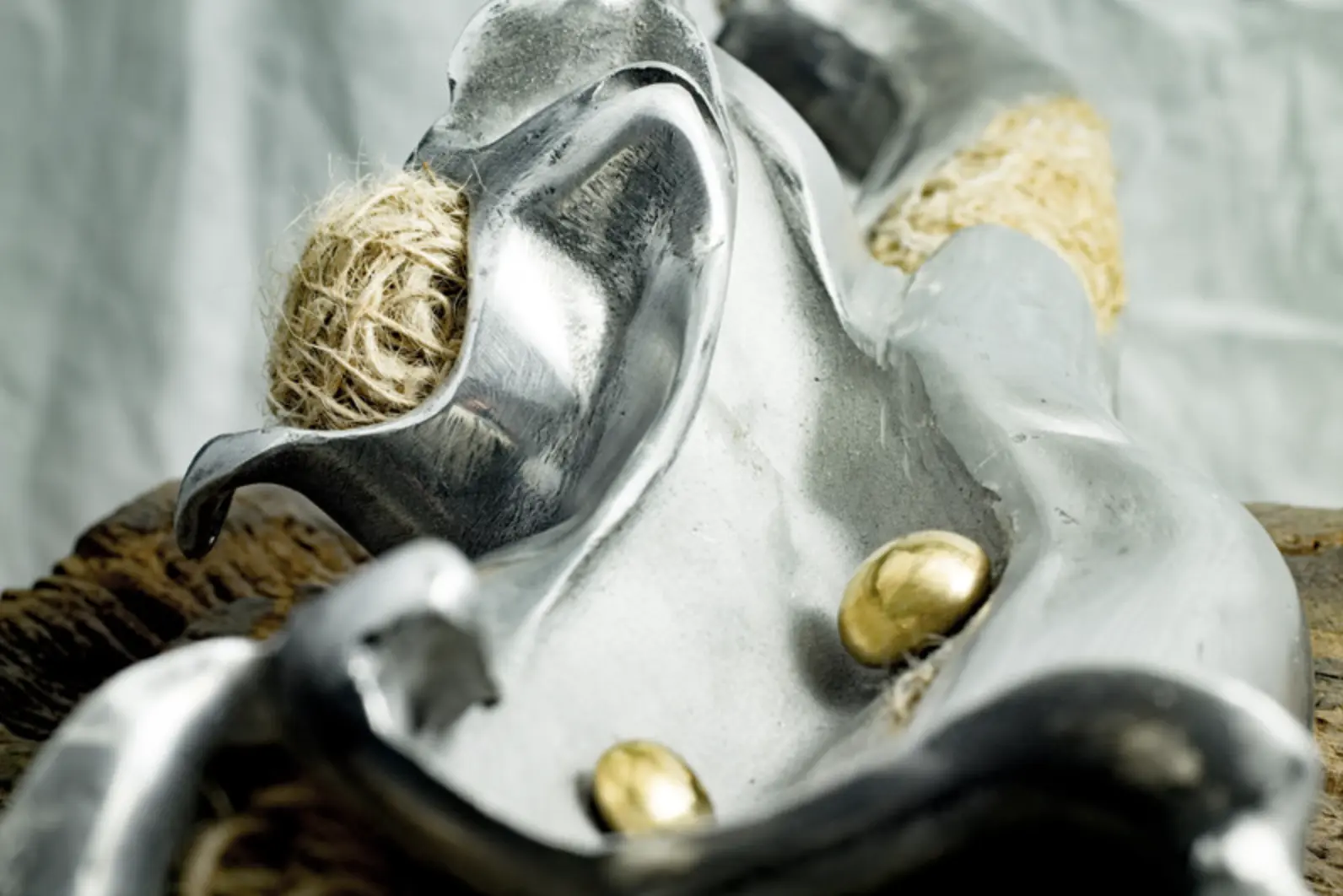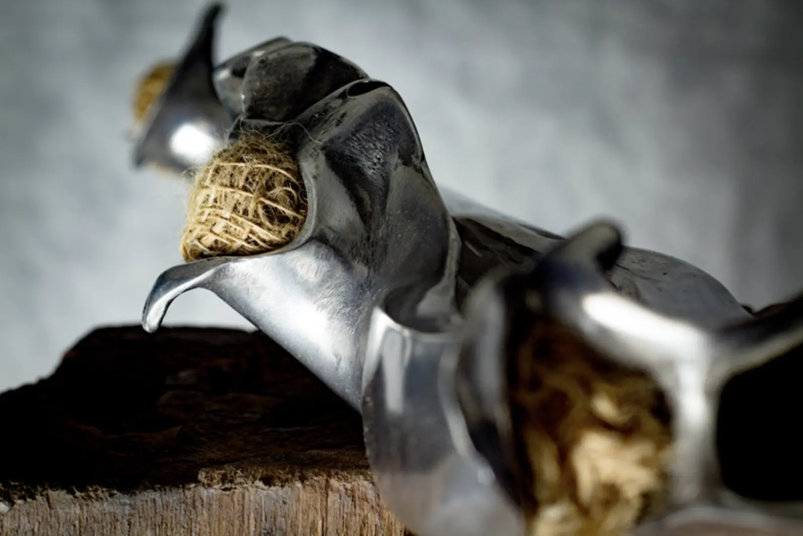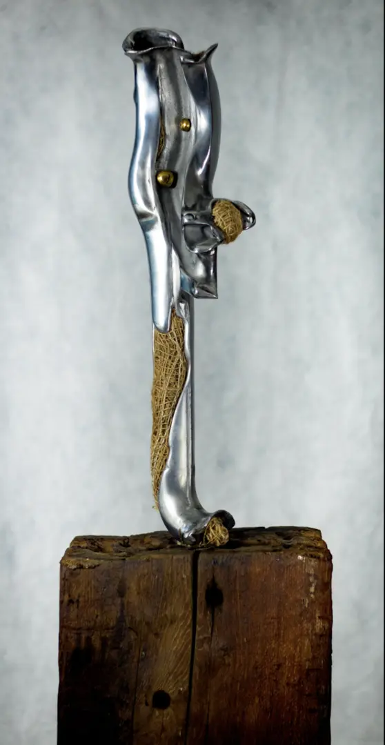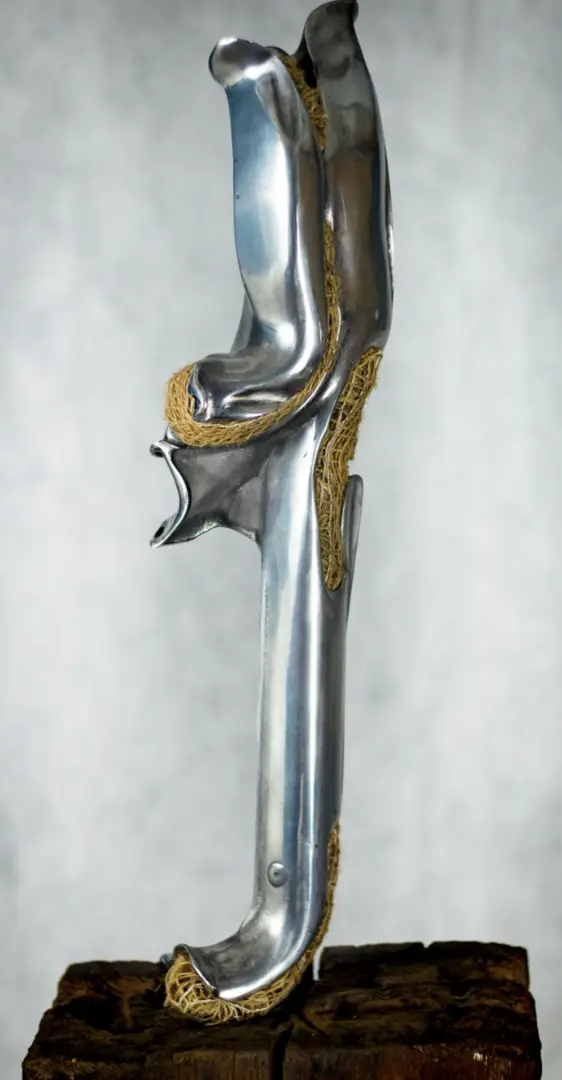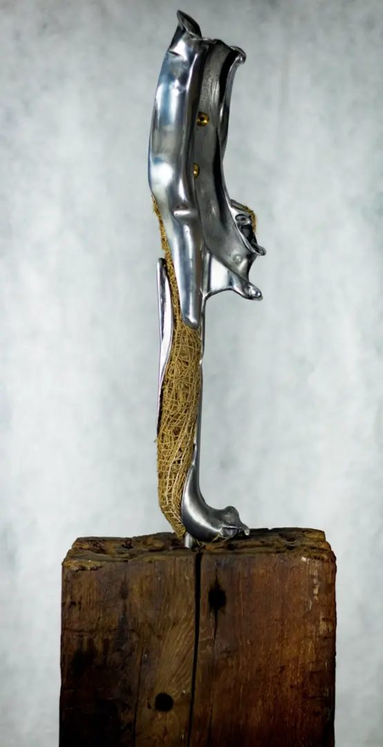 The sculpture is expertly crafted and polished from aluminium, enhanced by delicate brass accents that draw the eye. Graceful, undulating metal lines intertwine with soft fabric, shaping a captivating object that evokes the essence of an organic musical instrument. From the smooth, inviting recesses of the piece, two shimmering drops of brass dew cling precariously, as if they were melodies gently cascading from the heart of the sculpture, inviting whispers of harmony into the air.