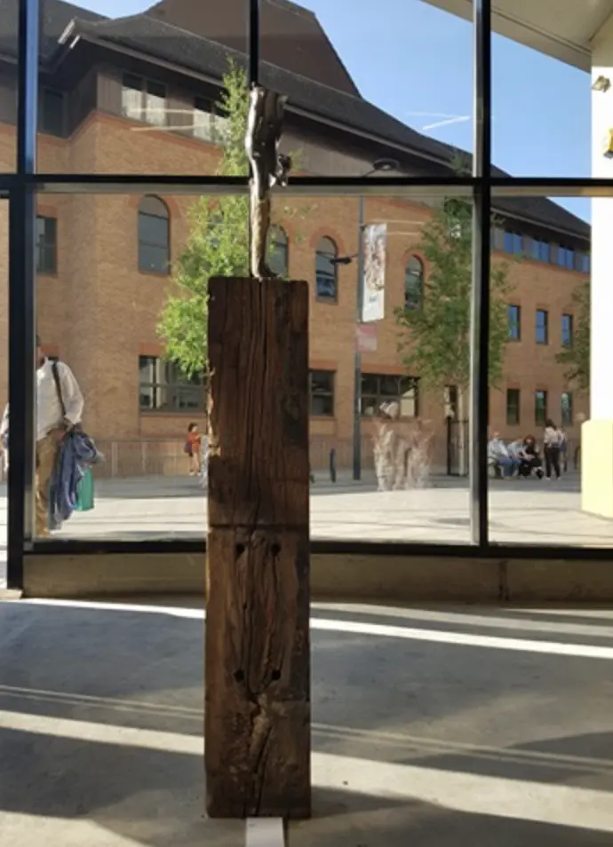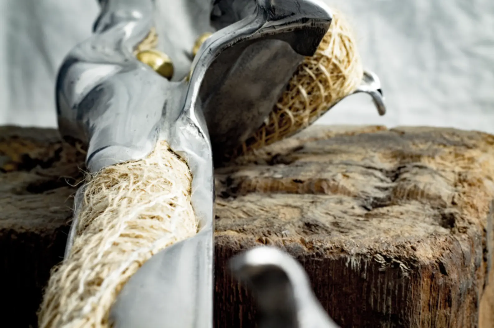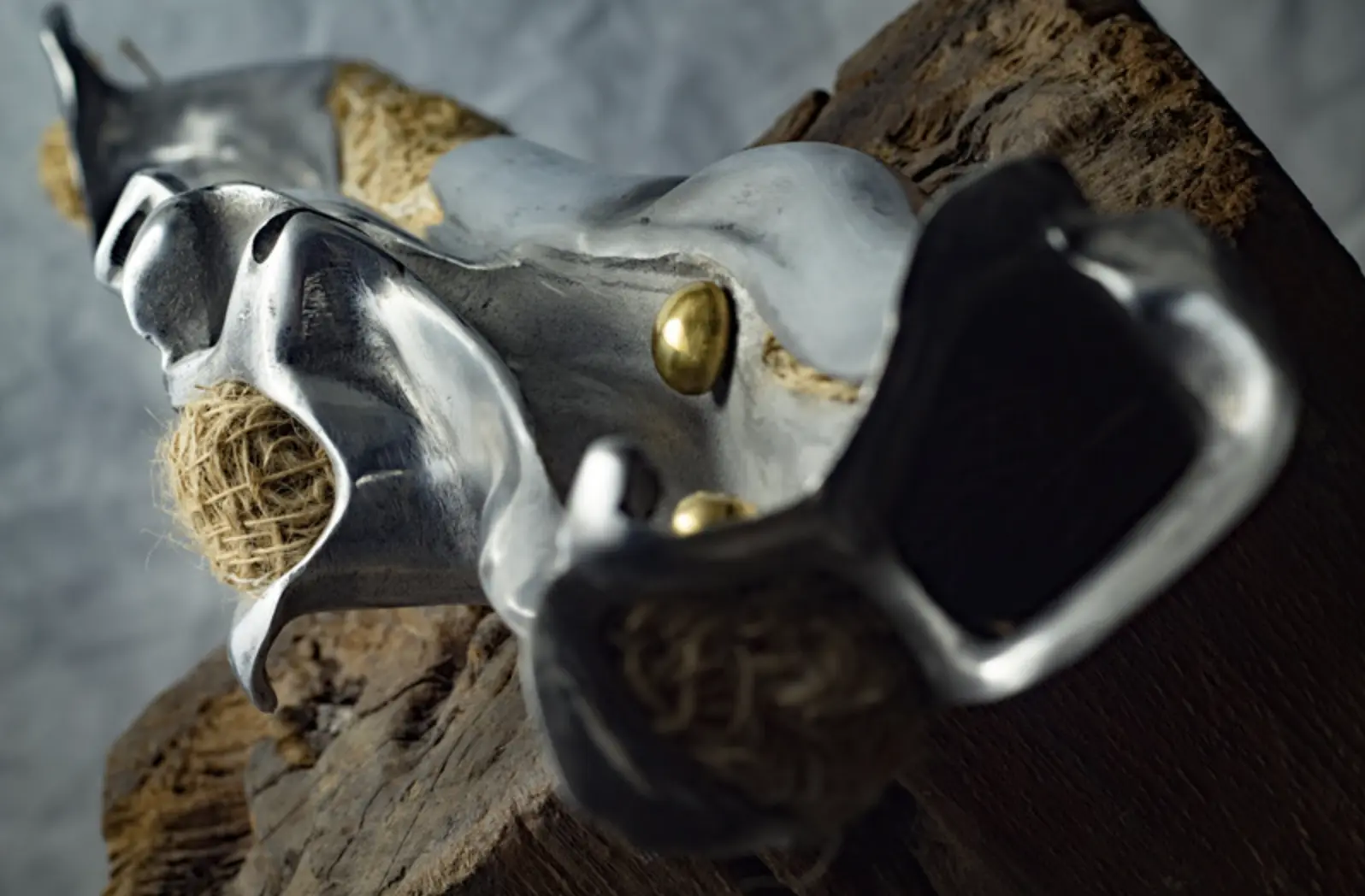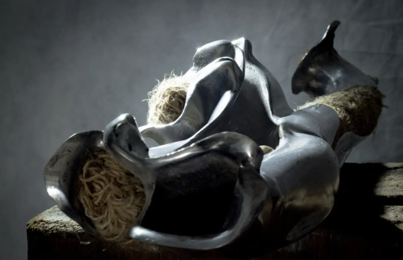 The sculpture is expertly crafted and polished from aluminium, enhanced by delicate brass accents that draw the eye. Graceful, undulating metal lines intertwine with soft fabric, shaping a captivating object that evokes the essence of an organic musical instrument. From the smooth, inviting recesses of the piece, two shimmering drops of brass dew cling precariously, as if they were melodies gently cascading from the heart of the sculpture, inviting whispers of harmony into the air.